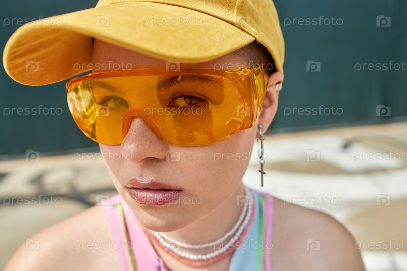 Девушка, смотрящая на камеру с желтыми солнцезащитными очками
