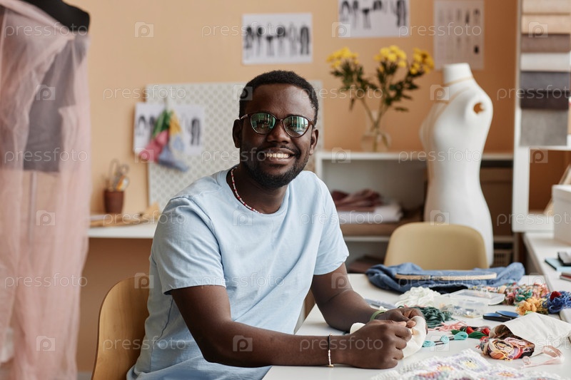 Юный улыбающийся афроамериканский дизайнер-мужчина в очках сидит за столом