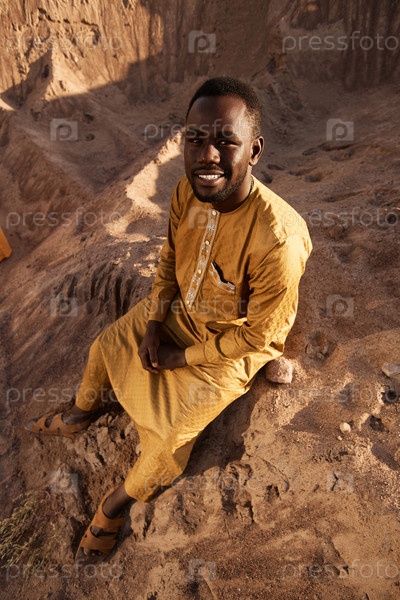 Улыбающийся афроамериканец сидит на песке под солнцем