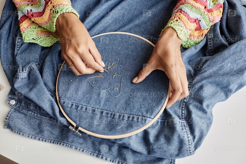 Выше угол рук молодой креативной женщины, делающей вышивки
