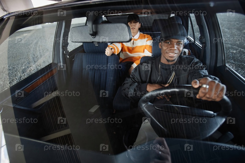 Молодой улыбающийся танцор хип-хопа управляет своей машиной и смотрит в камеру