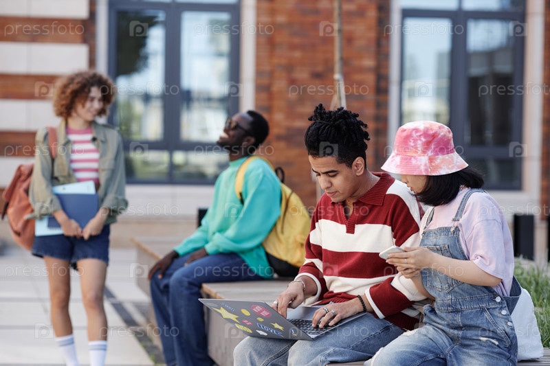 Разнообразная группа молодых студентов, сидящих в очереди на улице и изучающих с помощью ноутбука