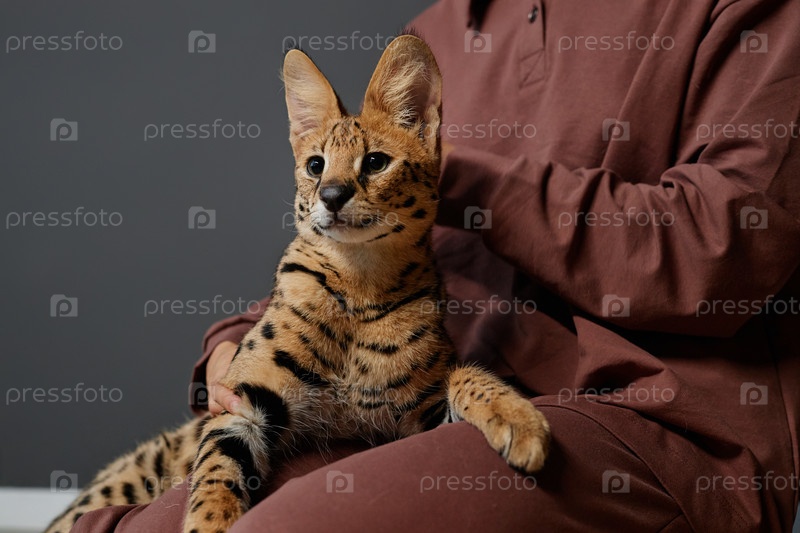 Грациозный Serval Cat сидит на коленях у девушки