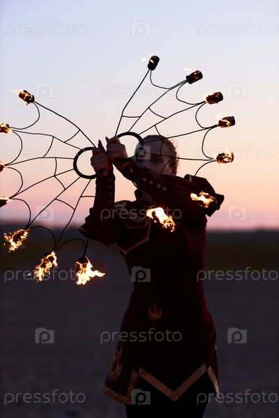 Женщина-исполнитель пожарного шоу танцует с горящими фанатами перед камерой