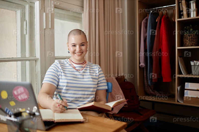 Улыбающаяся молодая женщина в общежитии колледжа и выполнение домашних заданий с помощью ноутбука