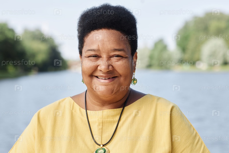 Откровенная старшая чернокожая женщина, улыбающаяся перед камерой на улице