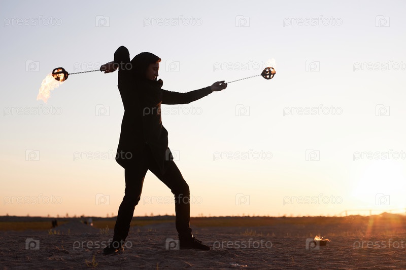 Исполнитель танцует с огнем Poi Male During Fire Show