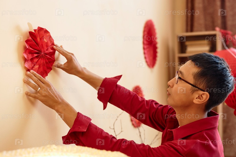 Азиатский мужчина вешает на стене красные бумажные украшения для празднования китайского Нового года