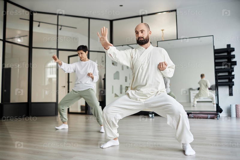 Инструктор по Цигун и ученик практикуют в тренажерном зале