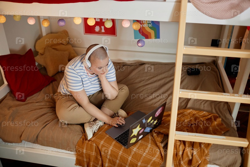 Молодая женщина с наушниками, использующая ноутбук в колледже