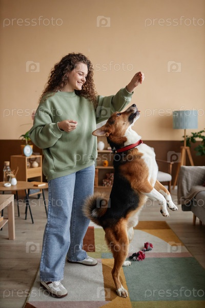 Счастливая девушка играет с собакой, прыгая за сладостями в доме