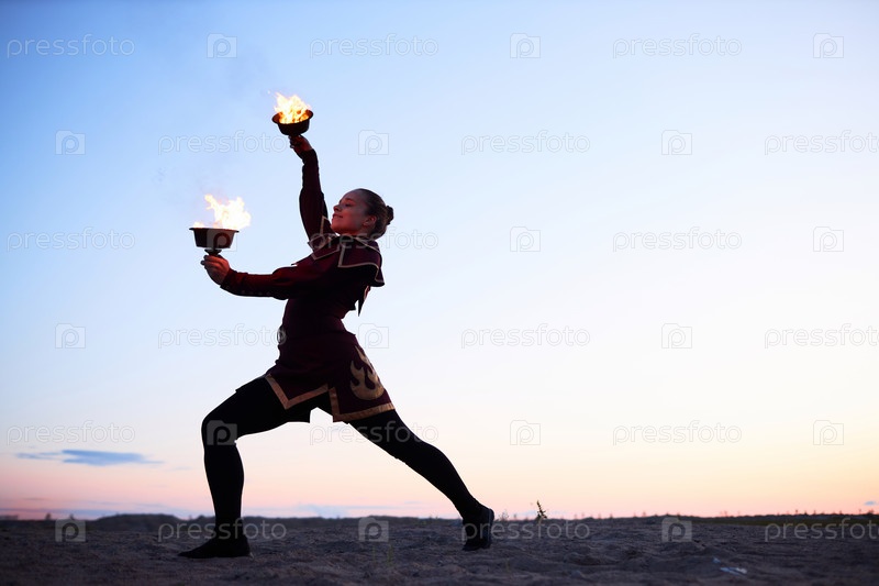 Женщина, танцующая с горящими мисками, выступает в огневом шоу