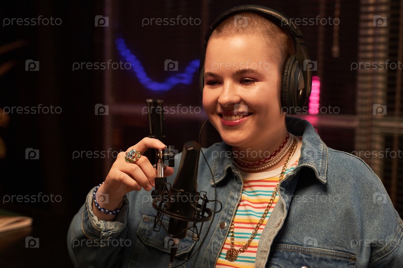 Веселая молодая женщина использует студийный микрофон
