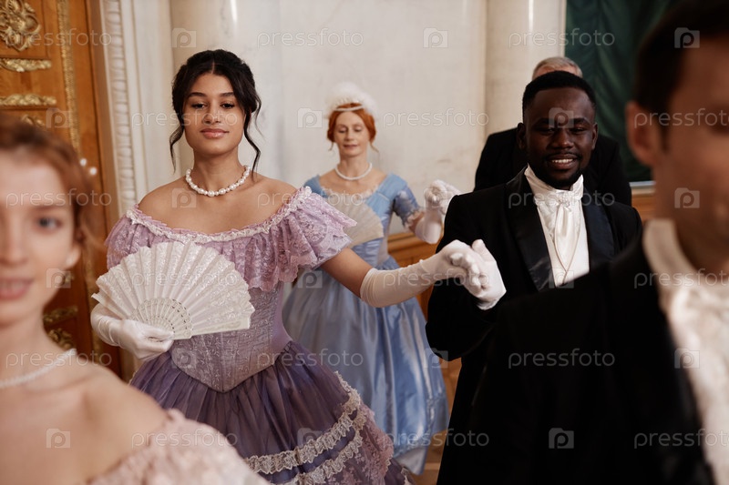 Разнообразная группа Леди и джентльмены наслаждаются танцевальным балом во Дворце