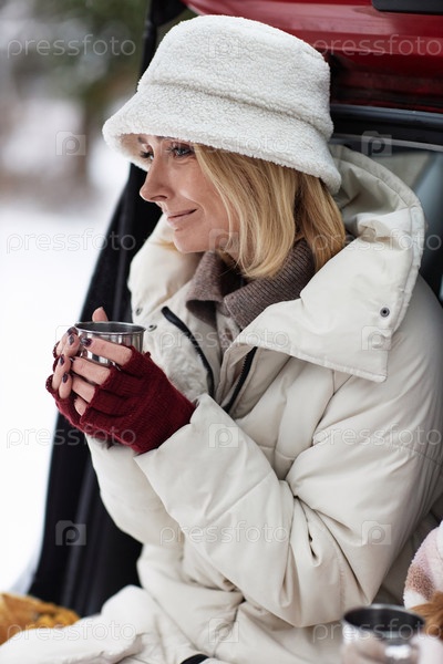 Боковой вид молодой безмятежной женщины с светлыми волосами, держащей чашку с горячим чаем