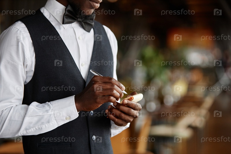 Снимок элегантного официанта, держащего блокнот в ресторане и готового принимать заказы