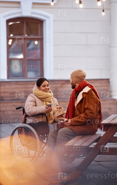 Инклюзивная молодая пара наслаждается закусками уличной еды на свидании