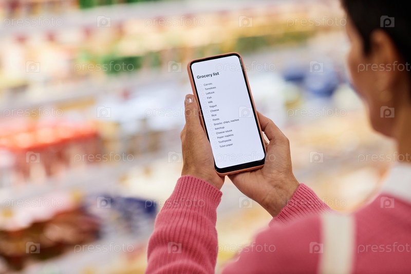 Близкий снимок женщины, держащей смартфон и читающей список покупок в супермаркете