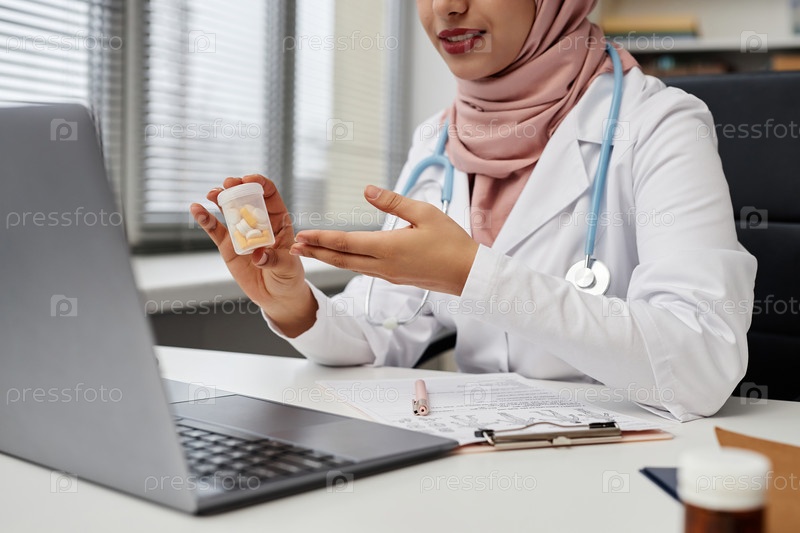 Мусульманка-врач показывает таблетки
