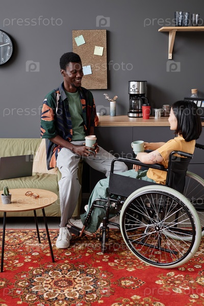 Молодая женщина-инвалид наслаждается разговором с коллегой во время перерыва на кофе