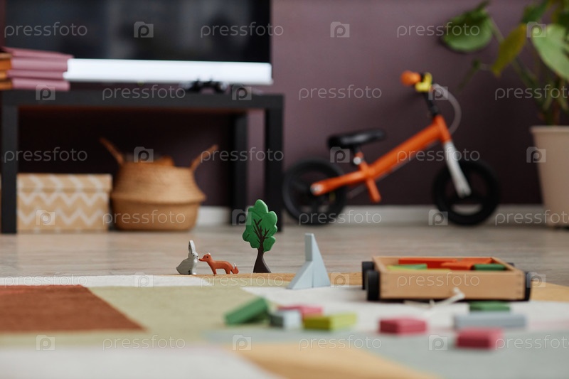 Закройте деревянный игрушечный набор на ковре в детской комнате