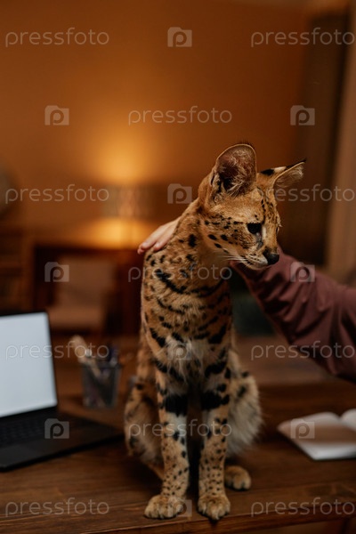 Сервал кот сидит за столом с девушкой