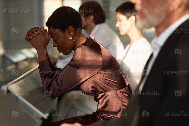 Черная взрослая женщина молится в церкви во время воскресной встречи, освещенной солнечным светом