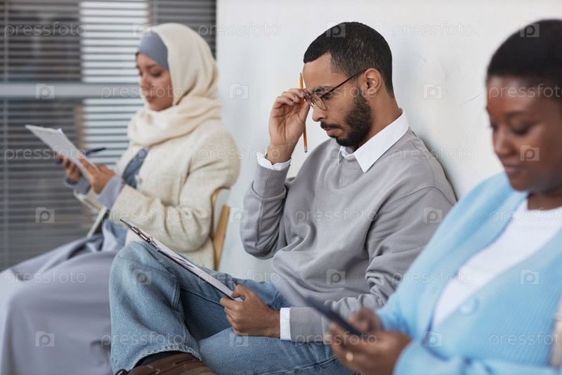 Сосредоточьтесь на молодом серьезном человеке, который просматривает вопросы формы заявления о визе