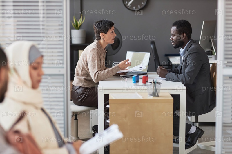 Боковой вид зрелого менеджера, задающего вопросы молодому кандидату-мужчине