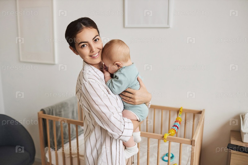 Улыбающаяся молодая мать держит мальчика в руках и улыбается перед камерой