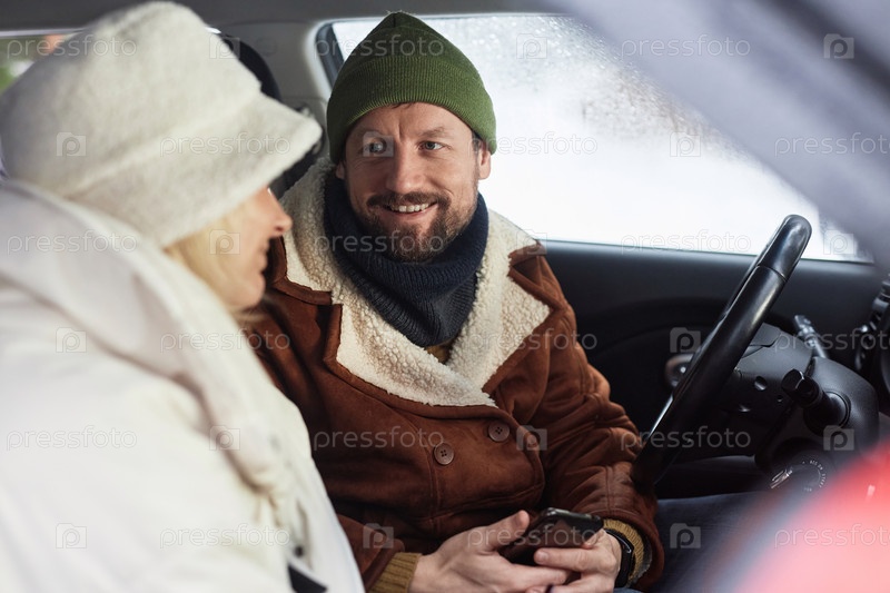 Сосредоточьтесь на улыбающемся бородатом мужчине со смартфоном в руке, который смотрит на свою жену