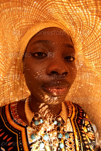 Рыбоглазая афроамериканская девушка в традиционном стиле одежды с соломенной шляпой