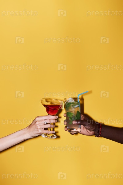 Минимальный ближайший снимок с двумя руками, отжимающими коктейли на жёлтом фоне