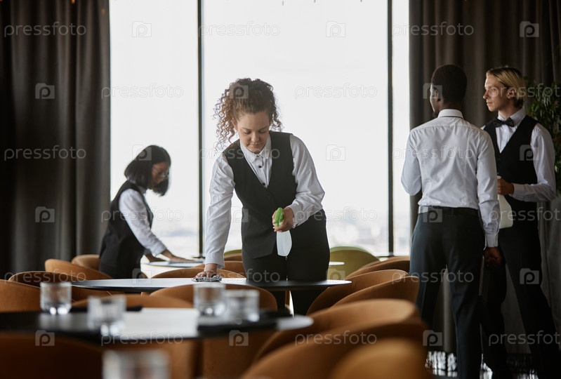 Сотрудники ресторана готовятся с молодой женщиной, стирающей столы