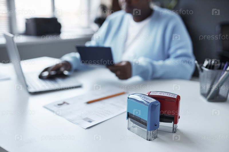 Утвержденные и отклоненные марки на столе с визовой заявкой и карандашом