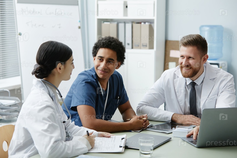 Группа из трех улыбающихся врачей встречается за столом в клинике