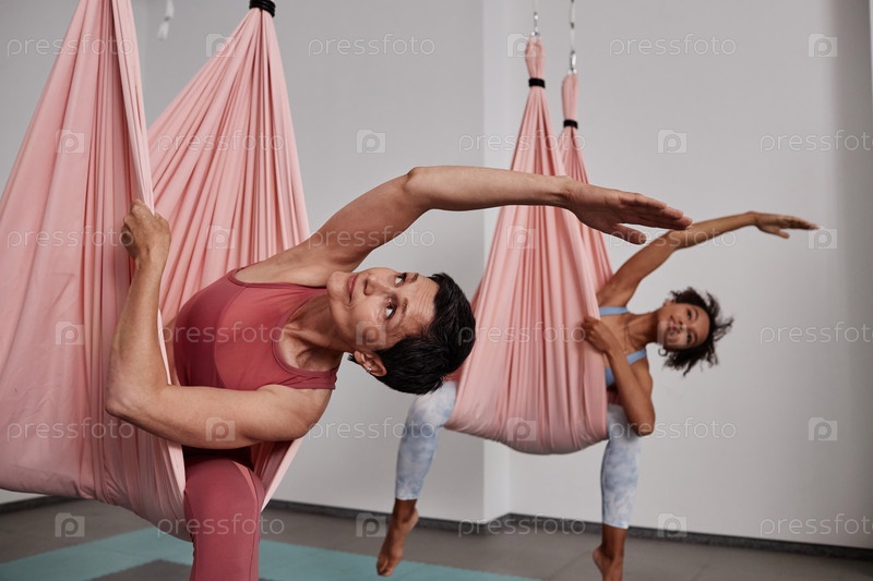 Женщины, наслаждающиеся воздушной йогой в гамаках