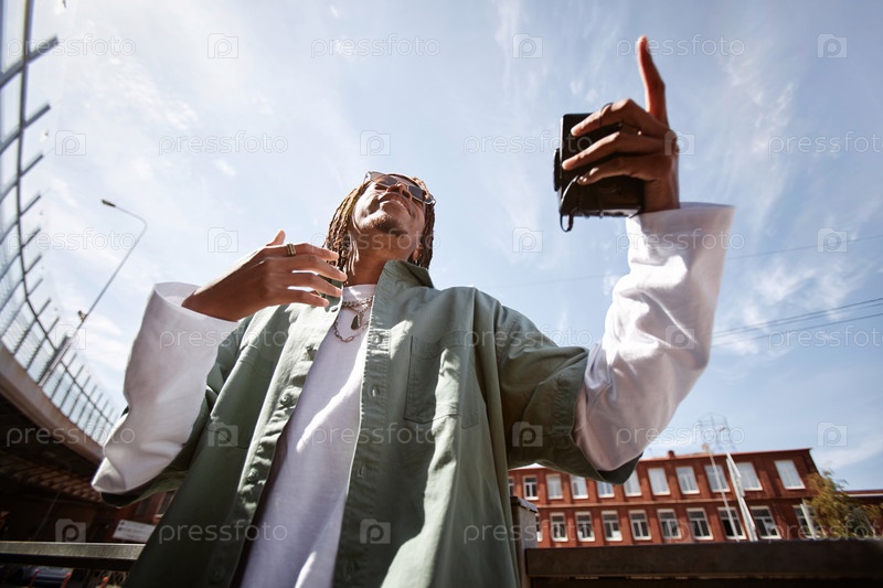 Вид снизу на молодого взволнованного афроамериканца, исполняющего хип-хоп