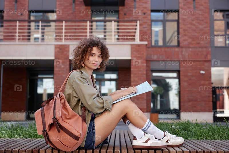 Милая молодая женщина сидит на улице в кампусе колледжа и делает домашнее задание