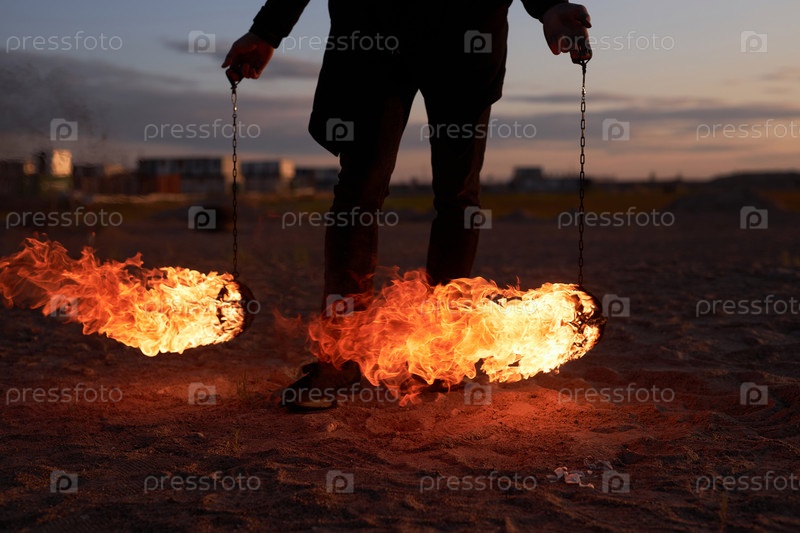 Человек, удерживающий горящий Poi в темноте во время выступления Fire Show