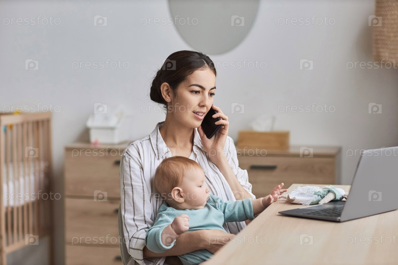 Женщина с ребенком, работающая из дома Молодая женщина