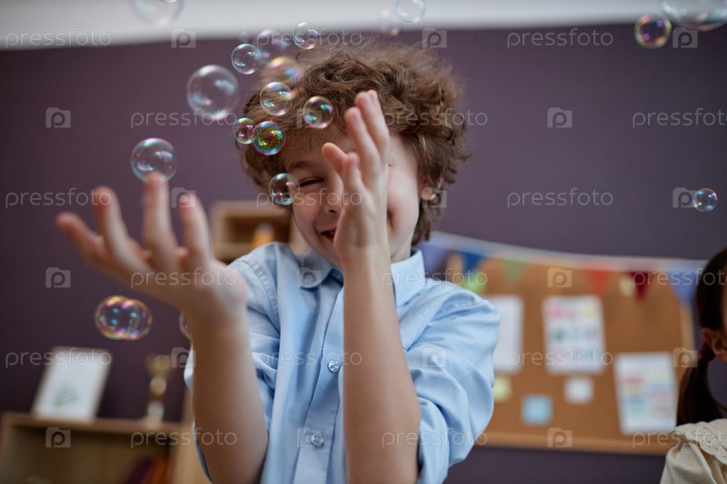 Маленький мальчик играет с мыльными пузырями в дошкольном возрасте и счастливо смеется