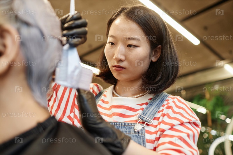 Близкий взгляд на парикмахера, применяющего краску для волос или отбеливатель к клиенту в салоне красоты