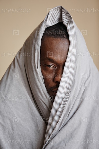 Депрессивный чернокожий мужчина, завернутый в одеяло и смотрящий на камеру