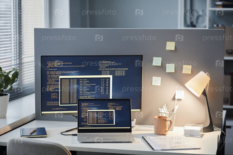 Настройка рабочего места с линиями кода на экранах компьютеров Office