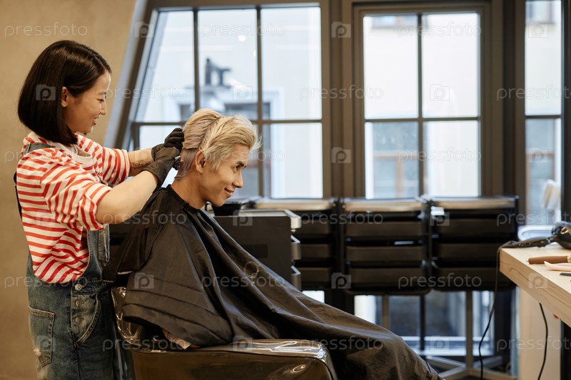 Улыбающийся молодой азиатский мужчина в салоне красоты