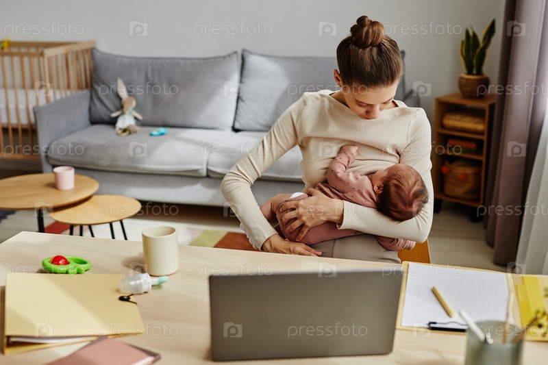 Мать кормит грудью ребенка во время рабочего времени