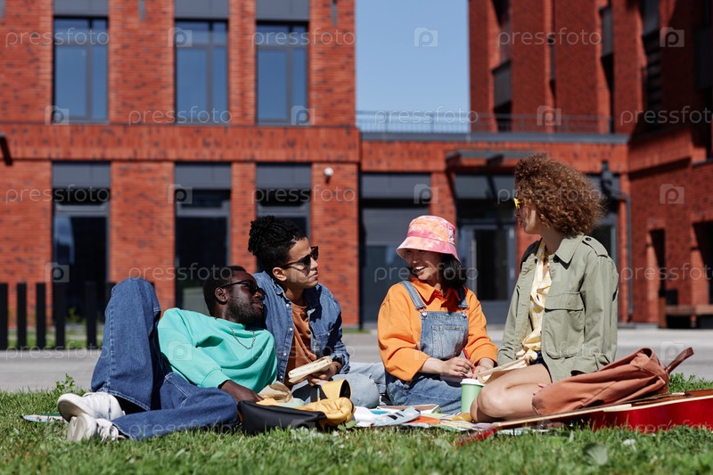 Веселые молодые студенты наслаждаются пикником на траве в современном кампусе колледжа
