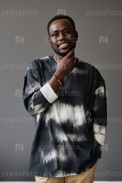 Молодой стильный афроамериканский мужчина в модном пуловере касается его лица