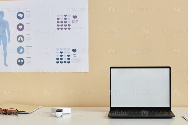 Минимальный открытый ноутбук с макетом белого экрана на столе в кабинете врача